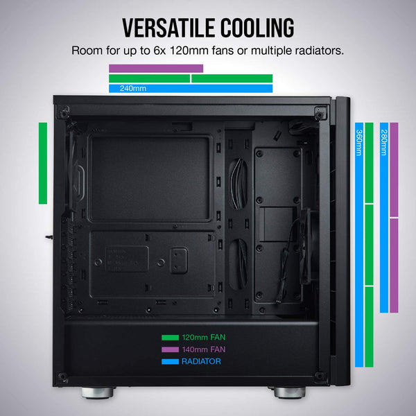 Room for up to six 120mm fans, or up to a 360mm radiator in front, 240mm radiator at top, and 120mm radiator in the rear.