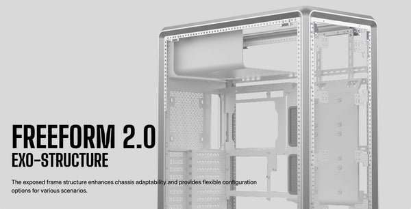 Premium mid-tower ATX case designed for airflow, versatility, and sleek aesthetics. Features a modular frame structure, tempered glass side panel, and multiple fan/radiator mounting options for high-performance builds.