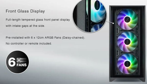 Pre-installed with 6 x 12cm ARGB Fans (Daisy-chained). No controller or remote included.
