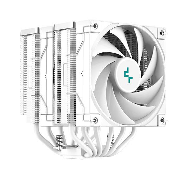 Achieve dominant cooling and silent efficiency with the DeepCool AK620 WH High Performance CPU Cooler equipped with six copper heat pipes stacked with a dense dual-tower fin array and two 120 FDB fans.