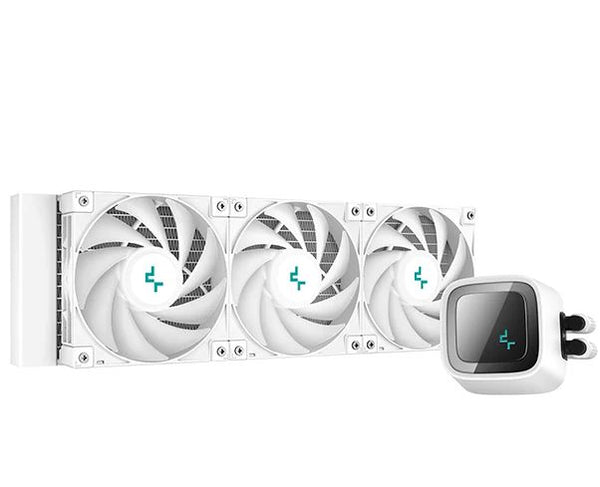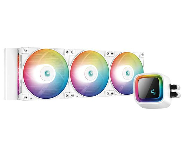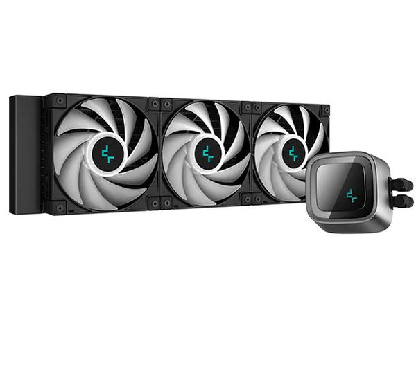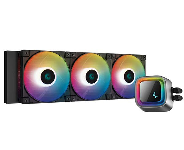 The DeepCool LS720 premium liquid CPU cooler maximizes cooling performance and low-noise efficiency with a 360mm radiator, three FC120 A-RGB PWM fans, and an infinity mirror cap design.