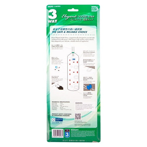 DE 293 3 Way Elegant Socket Strip With Surge Protector 2 Meter