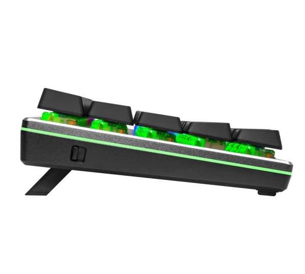 Sculpted keycaps improve typing comfort, and repositionable feet allow for adjustable typing angles