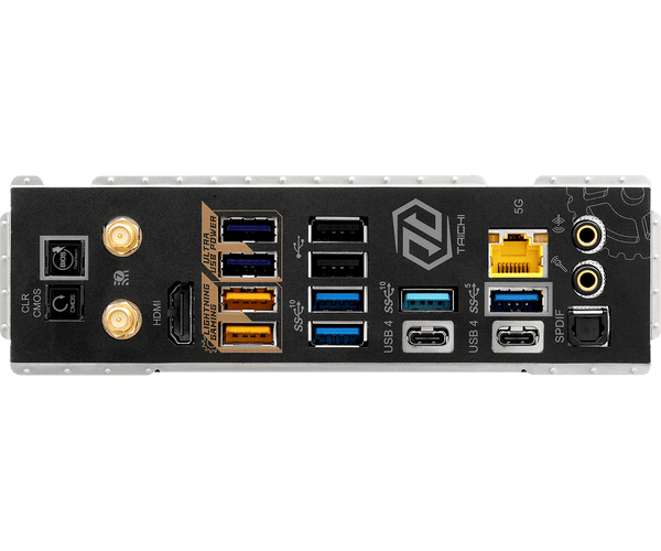 Graphics options include HDMI 2.1 (up to 4K 120Hz) and USB4 Type-C ports (up to 8K 30Hz, depending on CPU). Audio is top-quality with Realtek ALC4082, ESS SABRE DAC, and Nahimic Audio, supporting high-end headphones. Networking includes 5G LAN, Wi-Fi 7, and Bluetooth 5.4.