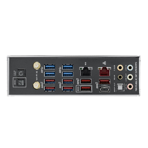High-performance networking: On-board Wi-Fi 6 (802.11ax) with MU-MIMO support, 5G and Gigabit Ethernet courtesy of Aquantia and Intel, both with ASUS LANGuard protection and support for GameFirst V software.