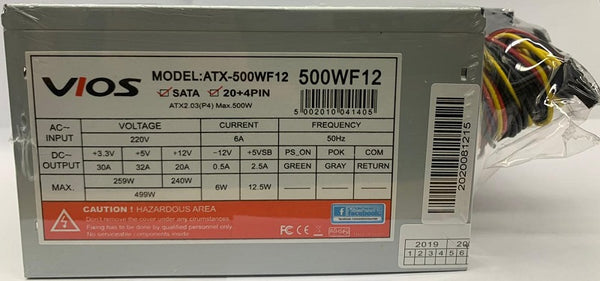 Vios ATX 500 Power Supply with 6 Pin PCIe and 12cm Fan, Bulk Pack 500WF12 Non Modular Voltage : 220V cable : 1 x 20+4 Pin, 1x 4Pin , 2x Sata , 1 x Molex Dimensions : 4140x 150x 84mm 1 Year Warranty