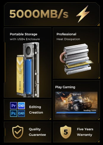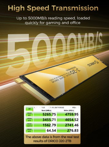 Model: ORICO-J20Color: GoldProtocol: NVMeRead Speed: Max.5000MB/sWrite Speed: Max.4500MB/sCapacity Options: 512GB, 1TBHeat Dissipation Accessory: Heatsink Fin, Thermal Silicone Pad, Heat-dissipating Metal Fin