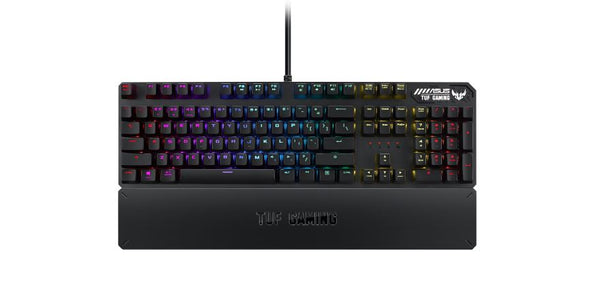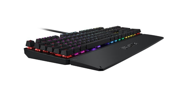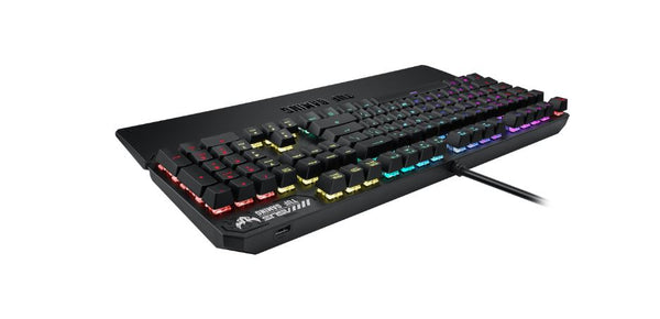 ASUS TUF Gaming K3 RGB mechanical keyboard with N-key rollover, combination media keys, USB 2.0 passthrough, aluminum-alloy top cover, wrist rest, eight programmable macro keys and Aura Sync lighting