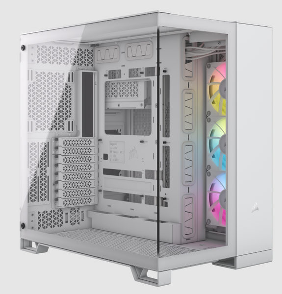The CORSAIR iCUE LINK 6500X RGB Mid-Tower Dual Chamber PC Case in white delivers a sophisticated build environment with its dual-chamber design, enhancing airflow and cable management for superior system cooling. Equipped with vibrant RGB lighting controllable through CORSAIR’s iCUE software, it allows precise customization for a seamless aesthetic. Its spacious interior supports extensive hardware configurations, making it an excellent choice for advanced PC builders seeking performance and style in a sleek, high-quality chassis.