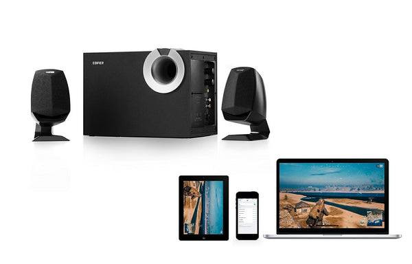 This is an all-in-one multimedia speaker that brings your Bluetooth and non-Bluetooth devices into harmony. You can pair all kinds of Bluetooth devices wirelessly such as your computers, smartphones, tablets, or you can also wire connect the speakers to those devices if they have a 3.5mm audio input.