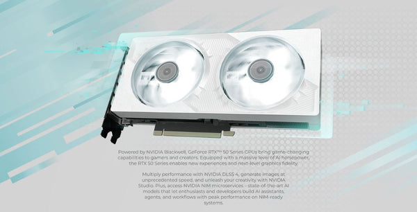 Powered by NVIDIA Blackwell, GeForce RTX™ 50 Series GPUs bring game-changing capabilities to gamers and creators. Equipped with a massive level of AI horsepower, the RTX 50 Series enables new experiences and next-level graphics fidelity. Multiply performance with NVIDIA DLSS 4, generate images at unprecedented speed, and unleash your creativity with NVIDIA Studio. Plus, access NVIDIA NIM microservices – state-of-the-art AI models that let enthusiasts and developers build AI assistants, agents, and workflows with peak performance on NIM-ready systems.